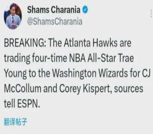 爆料王Shams:老鹰将特雷杨交易至奇才,换回CJ-麦科勒姆和科里-基斯珀特。