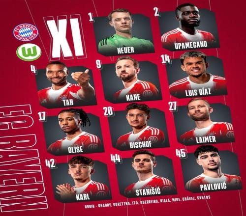 北京时间1月12日0:30,德甲第16轮,拜仁主场对阵沃尔夫斯堡。赛前首发公布。